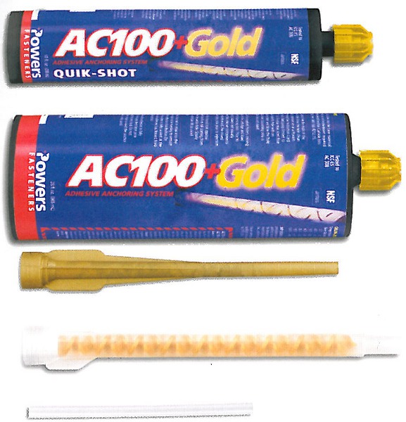 The AC100+Gold is a two-component vinylester adhesive anchoring system. The system includes injection adhesive in plastic cartridges, mixing nozzles, dispensing tools and hole cleaning equipment. The AC100+Gold is designed for bonding threaded and reinforcing bar hardware into holes in concrete and masonry base materials. • Mixing nozzle included with each cartridge • Code Approvals: ICC-ES ESR-2582 Scroll down for full product description